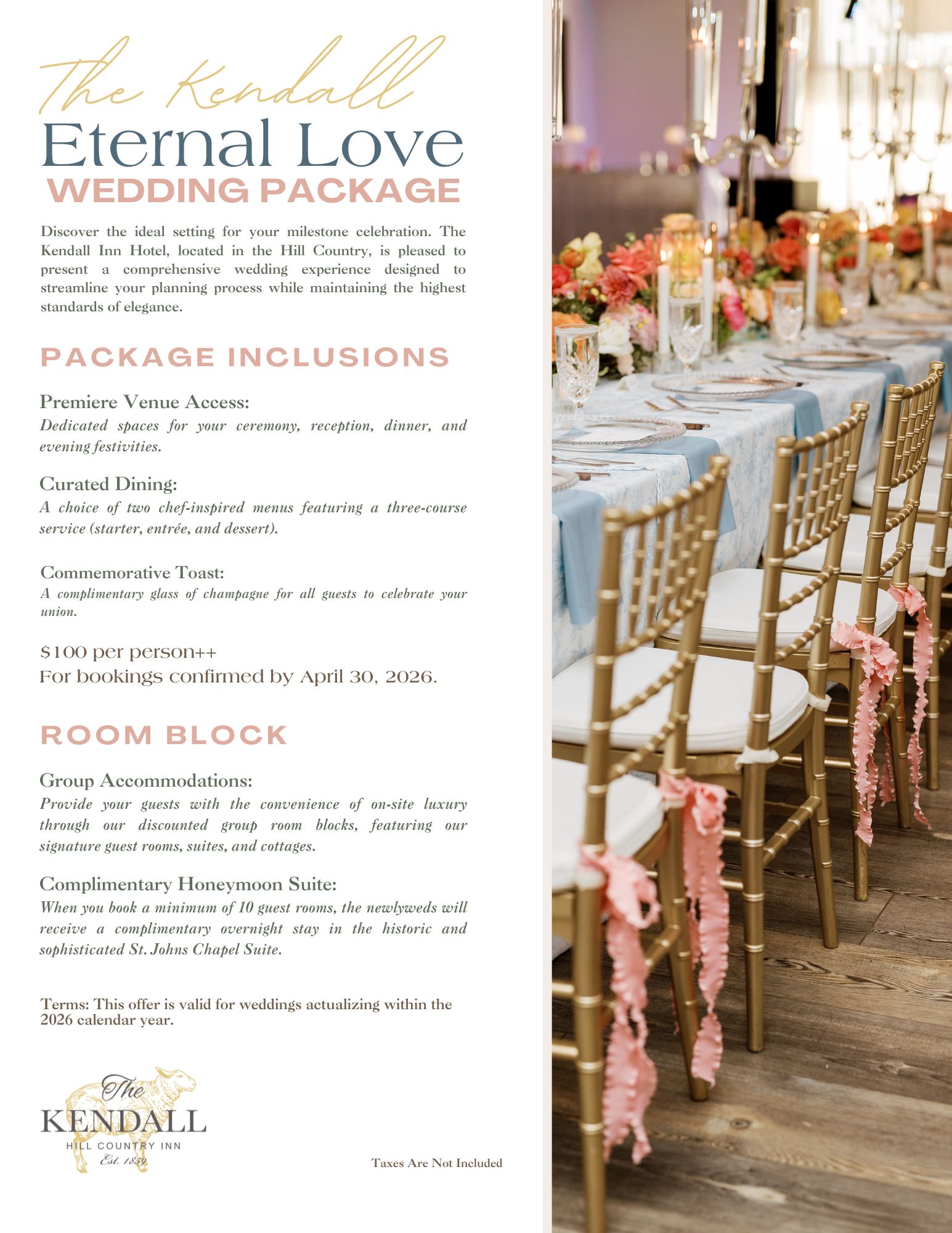 Introducing The Kendall Eternal Love Wedding Package at The Kendall Hill Country Inn in Boerne, Texas. Designed to blend historic elegance with seamless planning, this all-inclusive experience offers premier venue access for your ceremony and reception, chef-inspired curated dining, a celebratory champagne toast for your guests, and exclusive group accommodations for your wedding party.